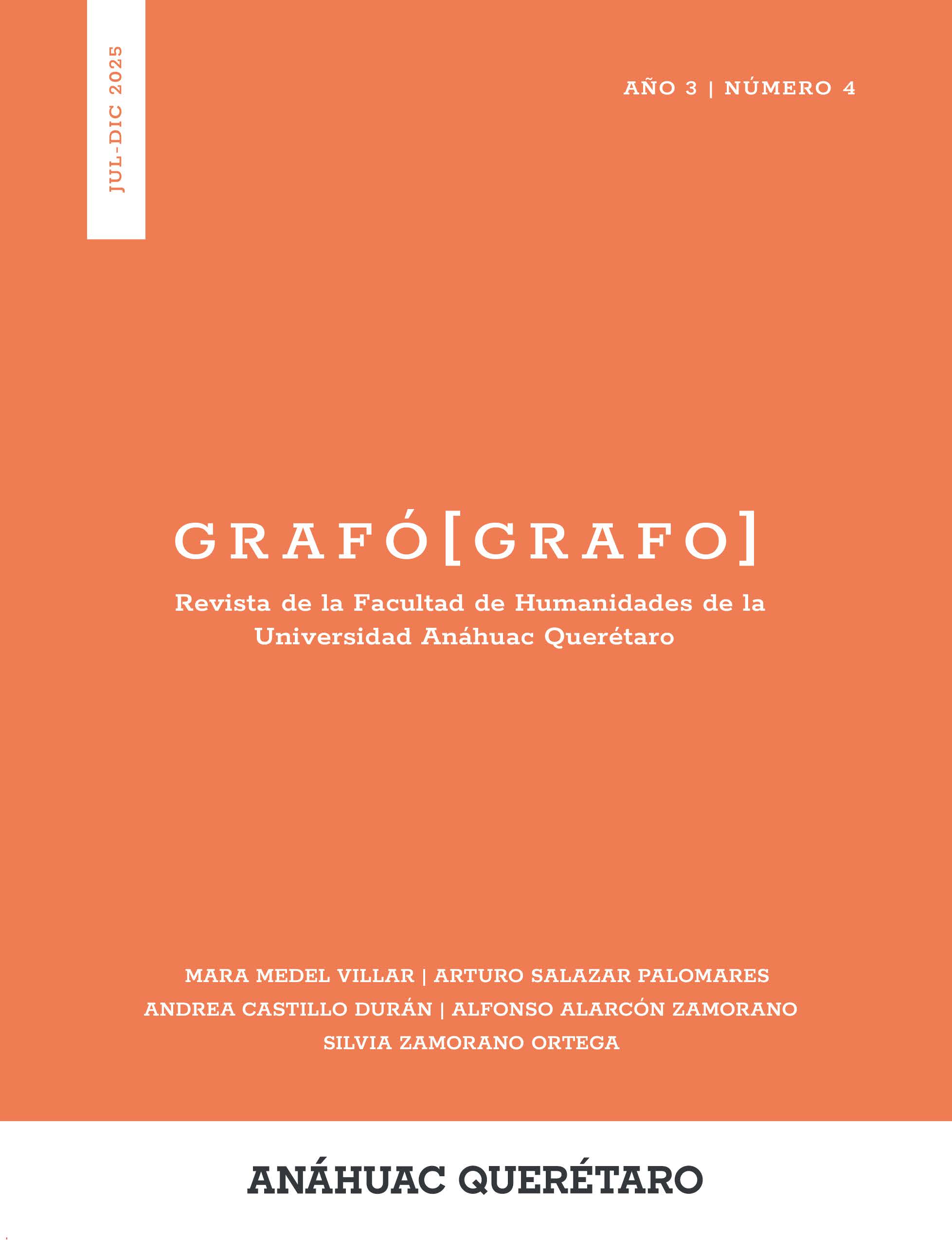 Grafó[grafo]. Revista de Investigación de la Facultad de Humanidades de la Universidad Anáhuac Querétaro. Año 3, No. 4, julio-diciembre 2025, es una publicación semestral editada por la Universidad Anáhuac Querétaro, a través de la Facultad de Humanidades. Calle Circuito Universidades I, Km. 7, Fracción 2, Municipio El Marqués, C.P. 76246, Querétaro, México, Tel. 442 245 6742 (ext. 1226), revistagrafografo@anahuac.mx. Editor responsable: Felipe Adrián Ríos Baeza. Titular: Investigaciones y Estudios Superiores. Reserva de Derechos al Uso Exclusivo No. 04-2025-090812031700-102 otorgado por el Instituto Nacional del Derecho de Autor; ISSN impreso: 3061-7928; ISSN digital: en trámite; Certificado de Licitud de Título y Contenido: en trámite, otorgado por la Comisión Calificadora de Publicaciones y Revistas Ilustradas de la Secretaría de Gobernación. Impresa en Printor Technology. José Frontera N°9, Col. Mercurio, C.P. 76040, Querétaro, Qro., México.